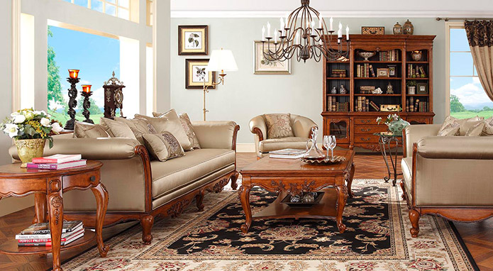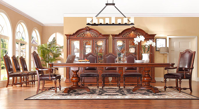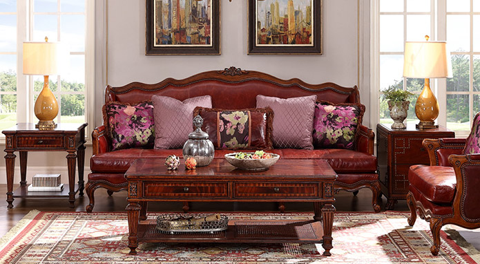 維拉莊園這一套系融合了各個(gè)時(shí)期的經(jīng)典設(shè)計(jì),既有英國(guó)攝政時(shí)期的莊嚴(yán)舒適,也有法國(guó)路易·菲利浦時(shí)期的古典雅致,富有感染力的溫暖涂裝,精巧的木皮工藝,精美鐵藝線條等完美配合,散發(fā)著舊時(shí)光的魅力,同時(shí)也為“奢華”設(shè)立了新標(biāo)準(zhǔn),讓任何一個(gè)鄉(xiāng)村或者城市的家再現(xiàn)高雅。櫻桃木與黃花樟樹(shù)瘤拼花飾面,配以V型鏤槽和凹凸不平面板效果,使家具更顯大氣,精致的手工雕刻,莊重典雅,配以大理石,皮革帶來(lái)不同的家居感受,少量的破壞處理巧妙的增添了歲月的痕跡,彰顯了莊園氣勢(shì)。
