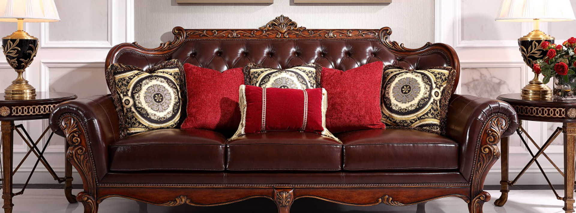 以傳統(tǒng)美式風格為基調(diào),自然、巧妙地融入各種現(xiàn)代時尚經(jīng)典的新元素。整個系列采用美洲白桃花芯木,配以意大利進口印花、壓花牛皮。產(chǎn)品運用靈活的線條和靈動的裝飾。崇尚原材料的自然紋理,質(zhì)地渾厚,氣息優(yōu)雅。 傳統(tǒng)而經(jīng)典的客廳沙發(fā),采用了高品質(zhì)的頭層油臘皮和維多利亞棉花鳥印花棉布。細膩而別致的精巧雕花。舒適、優(yōu)雅而不失奢華。