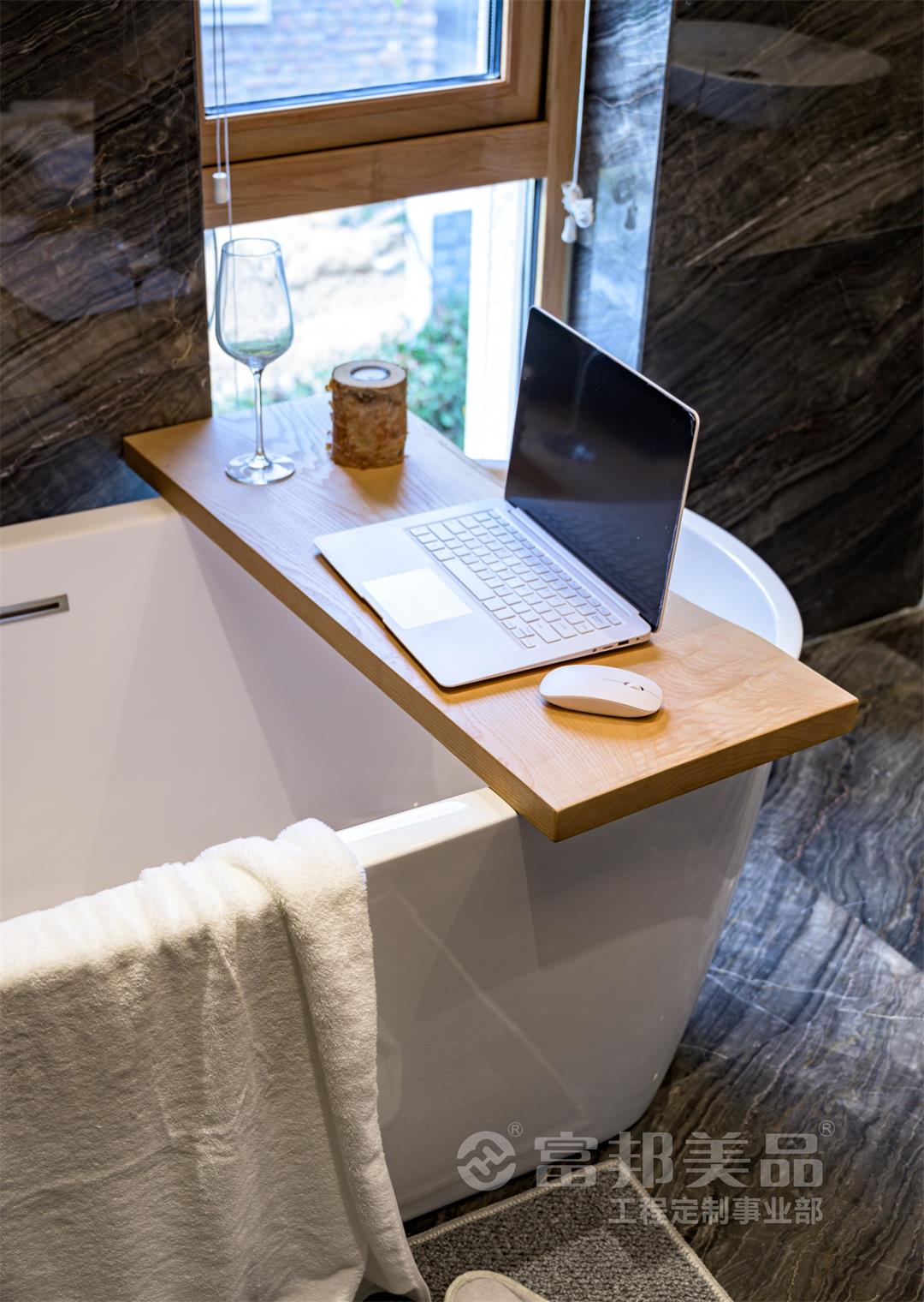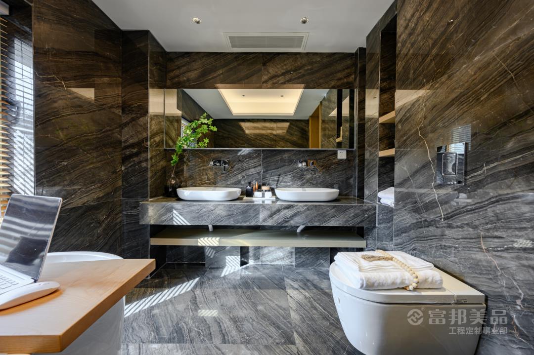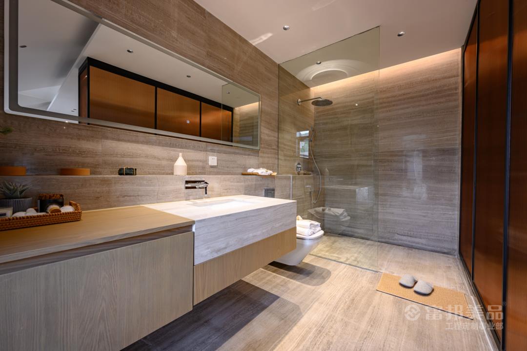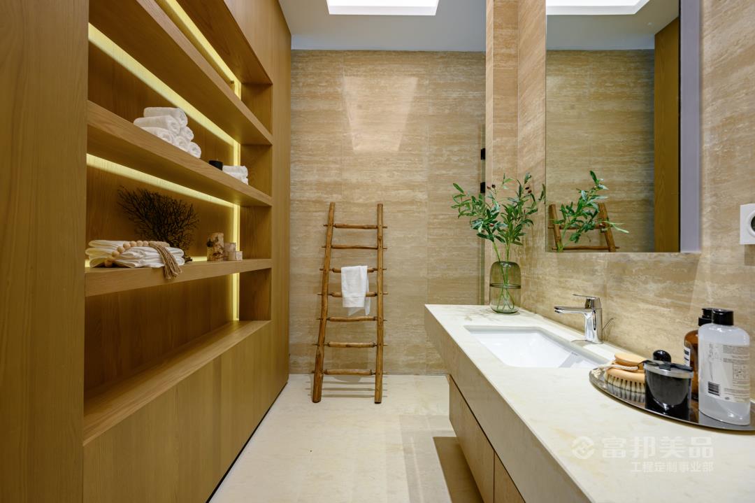 簡(jiǎn)潔、大方是映入眼簾的第一印象,木制作品和大理石的搭配散發(fā)出的柔光,使得浴室成為結(jié)束一天疲勞工作之后洗去一身疲憊讓身心放松的完美場(chǎng)所。