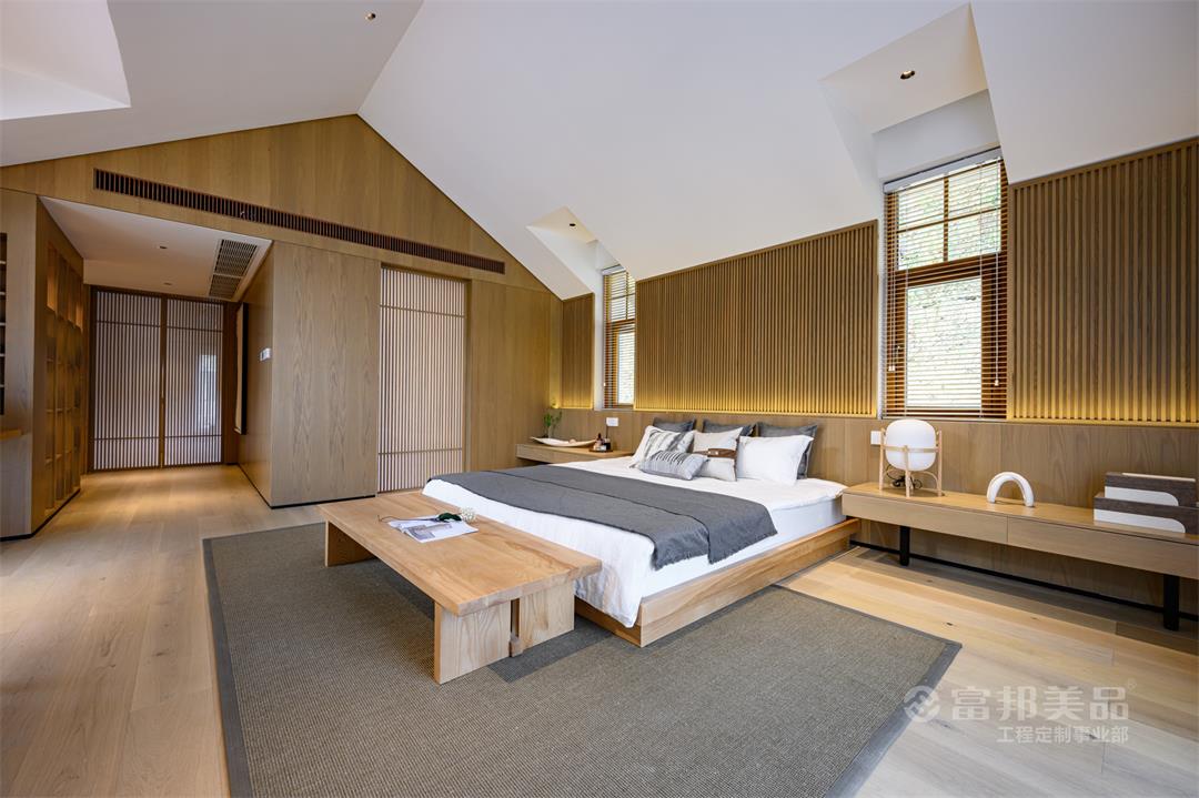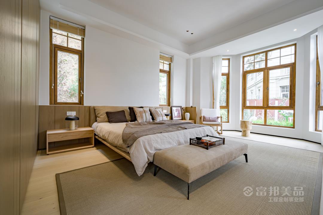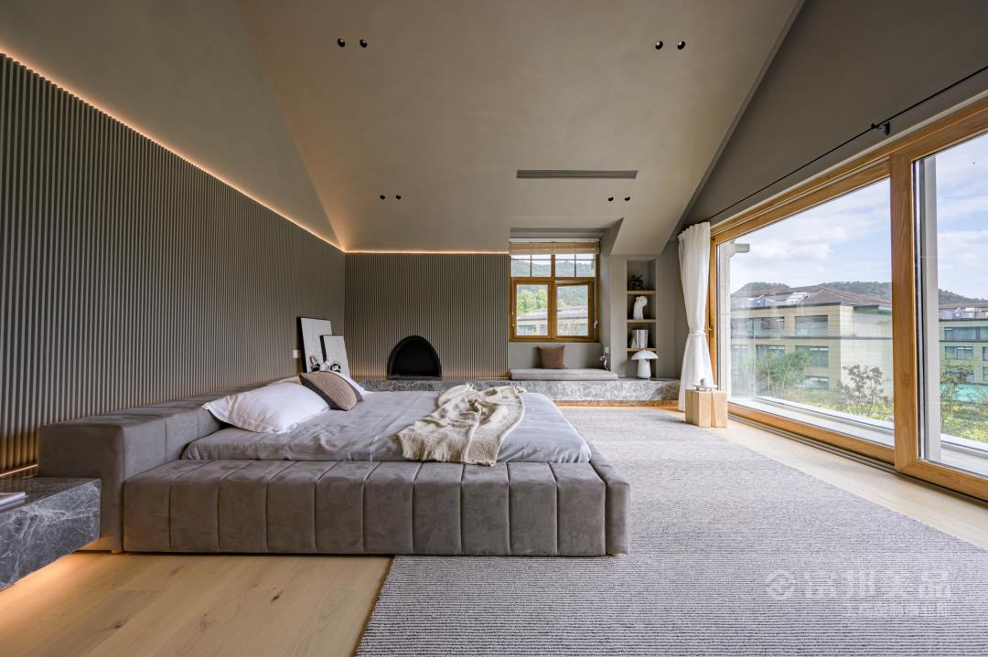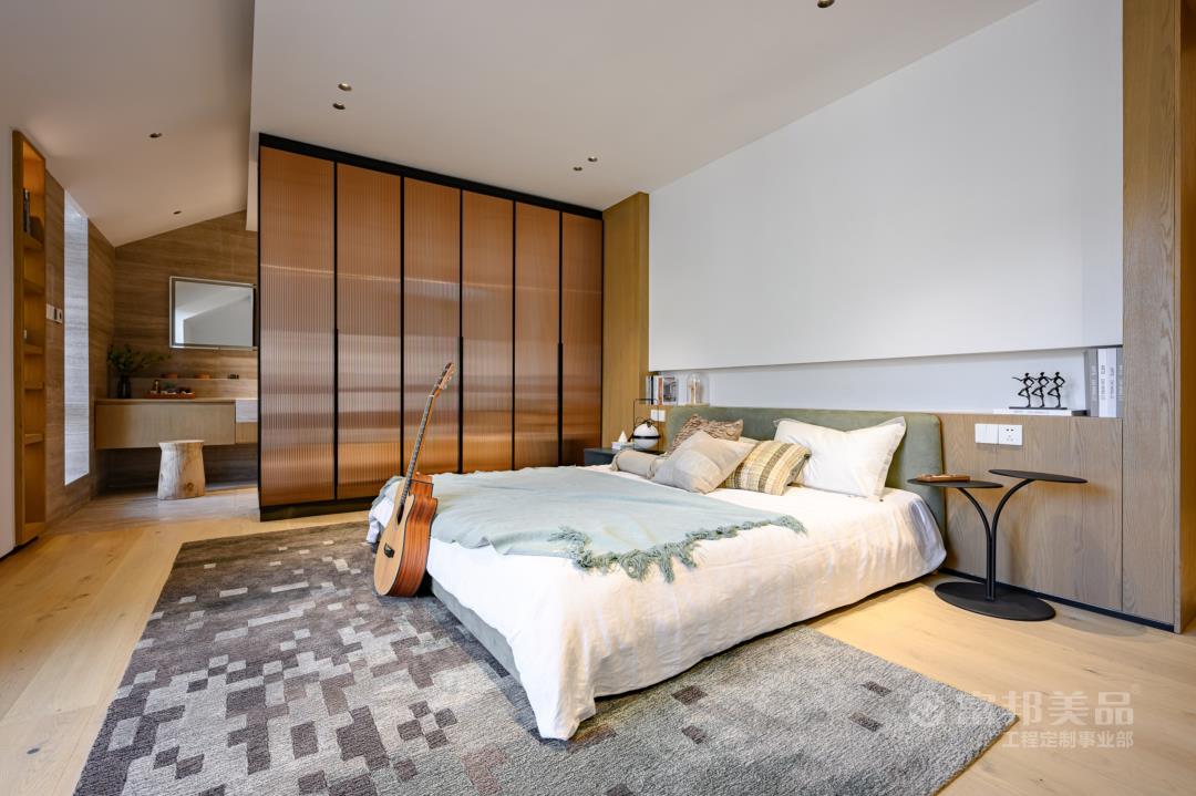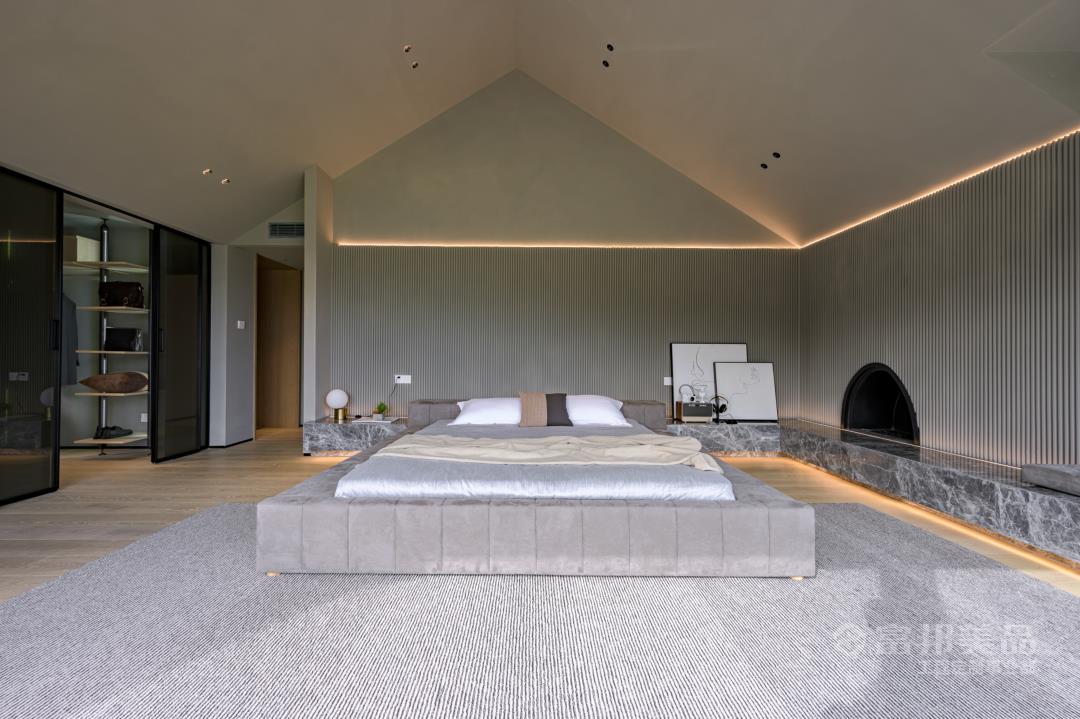 臥房空間的素雅,現(xiàn)代的氣質(zhì)體現(xiàn)于細(xì)微之處,窗外的竹林與室內(nèi)的光影墻面相得益彰,床品的選料、紋案,都在呼應(yīng)著湖間山水意境。