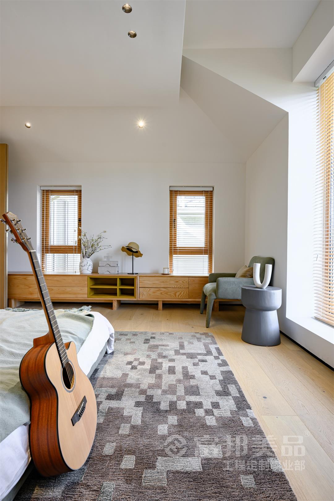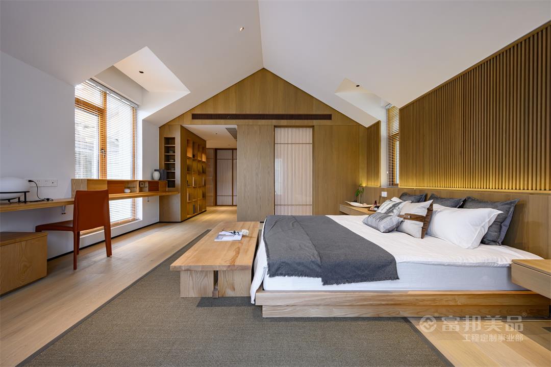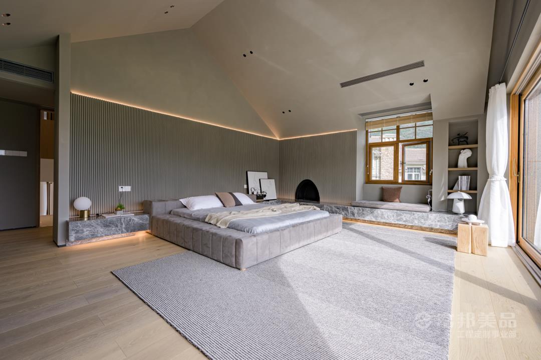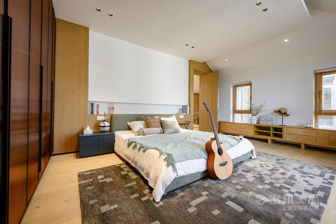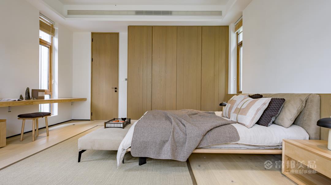 臥房空間的素雅,現(xiàn)代的氣質(zhì)體現(xiàn)于細(xì)微之處,窗外的竹林與室內(nèi)的光影墻面相得益彰,床品的選料、紋案,都在呼應(yīng)著湖間山水意境。